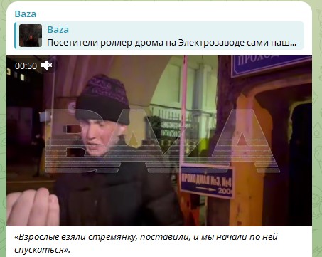19:10 Рассказ посетителя роллер-дрома об эвакуации с горящего Электрозавода: Мы спустились на железный пол, очень хрупкий. Дальше там была пропасть с железными и деревяными палками. Взрослые взяли стремянку, поставили и мы начали по ней спускаться и так потом мы вышли.