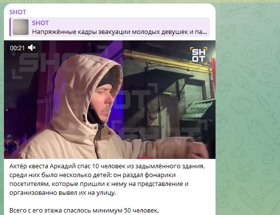 19:01 Актёр квеста Аркадий спас 10 человек из задымлённого здания, среди них было несколько детей: он раздал фонарики посетителям, которые пришли к нему на представление и организованно вывел их на улицу. Всего с его этажа спаслось минимум 50 человек.