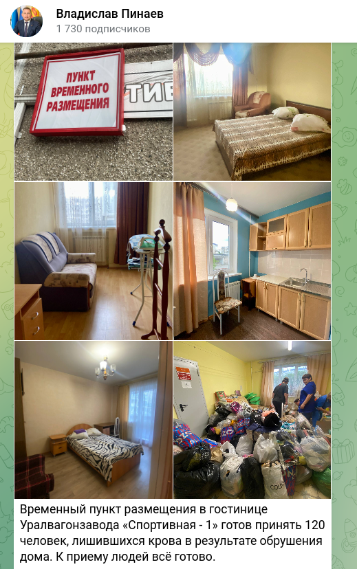 18:14. Временный пункт размещения в гостинице Уралвагонзавода "Спортивная-1" готов принять 120 человек, лишившихся крова в результате обрушения дома. "К приёму людей всё готово", - заявил мэр.
