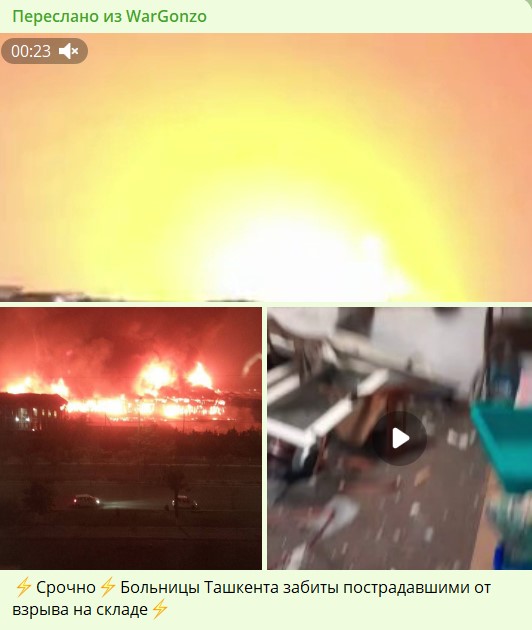 Однако раненых, скорей всего, в разы больше."Больницы Ташкента забиты пострадавшими от взрыва на складе. С мест сообщают, что в помещении таможенного склада возле аэропорта Ташкента было много работников, поэтому в больницы массово поступают пострадавшие. О точном количестве жертв пока не сообщается", - добавляют в канале WarGonzo.