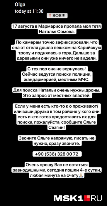 Позже близкие Сомовой обратились в социальных сетях за помощью, пытаясь найти людей с дронами.