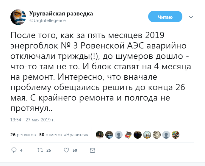 Как напоминает автор Twitter-аккаунта "Уругвайская разведка", за пять месяцев текущего года этот третий энергоблок пришлось аварийно отключать три раза. И вот теперь кто-то из ответственных лиц понял, что с ним "что-то не так".