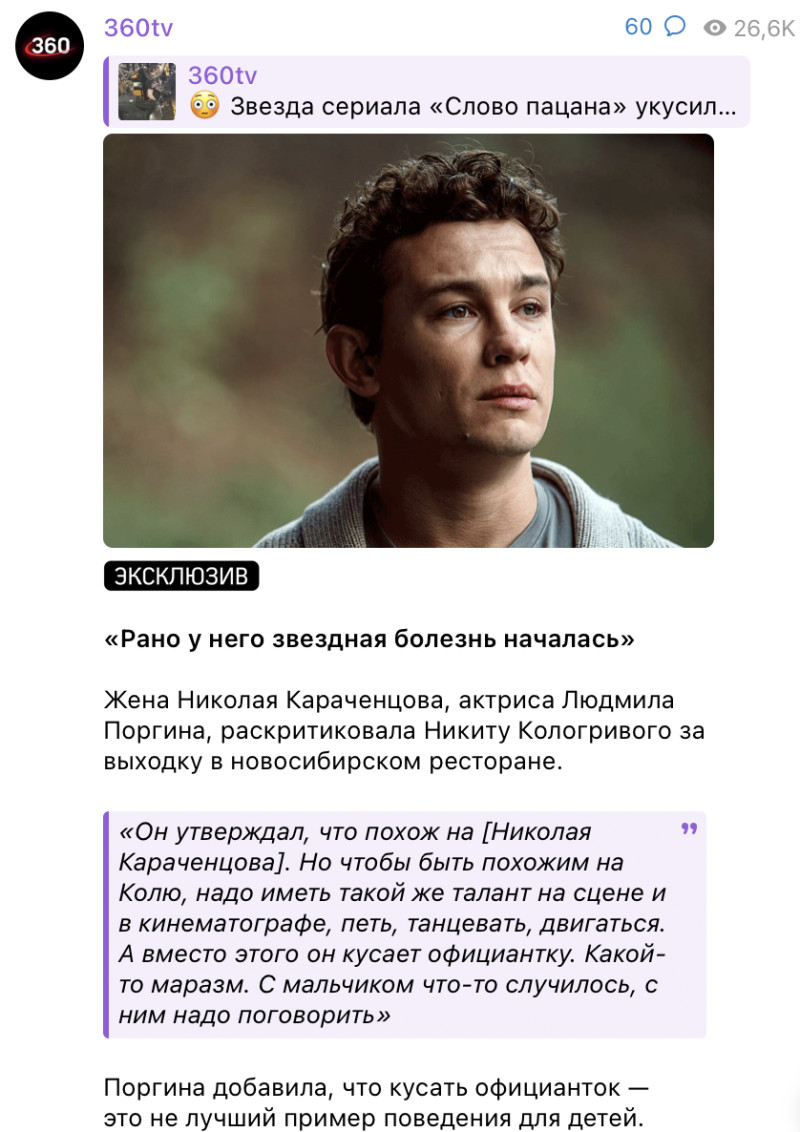Напомним, что Никита Кологривый появлялся в сериалах "Оффлайн" и "Два холма", а также сыграл главную роль в экранизации сказки "По щучьему велению". Однако наибольшую популярность ему принесла второстепенная роль в сериале "Слово пацана", где он сыграл лидера молодёжной группировки Кощея.