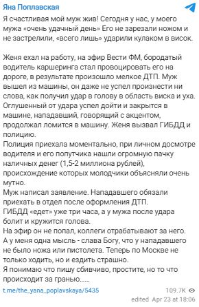 По словам артистки, её супруг, радиоведущий Евгений Яковлев, ехал в студию радио "Вести FM", однако по дороге встретил говорящего с акцентом "бородатого водителя каршеринга", который нарушил правила ПДД и устроил небольшую аварию. Когда Евгений вышел из машины, бородач набросился на него и ударил кулаком в область виска.