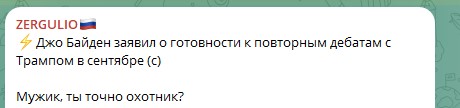 Джо Байден заявил о готовности к повторным дебатам с Дональдом Трампом в сентябре. Блогер Сергей Колясников не смолчал: "Мужик, ты точно охотник?".