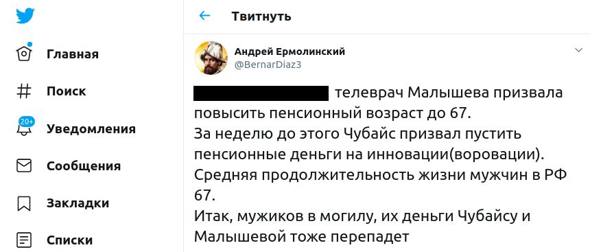 "Телеврач Малышева призвала повысить пенсионный возраст до 67. За неделю до этого Чубайс призвал пустить пенсионные деньги на инновации (воровации). Средняя продолжительность жизни мужчин в РФ 67, - напоминает Андрей Ермолинский, уточнив ниже под постом, что говорит о статистике 2017 года. - Итак, мужиков в могилу, их деньги Чубайсу. И Малышевой тоже перепадет".