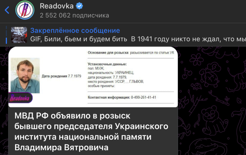 Как пишут авторы телеграм-канала Readovka, в отношении Вятровича возбуждено уголовное дело по статье о реабилитации нацизма.