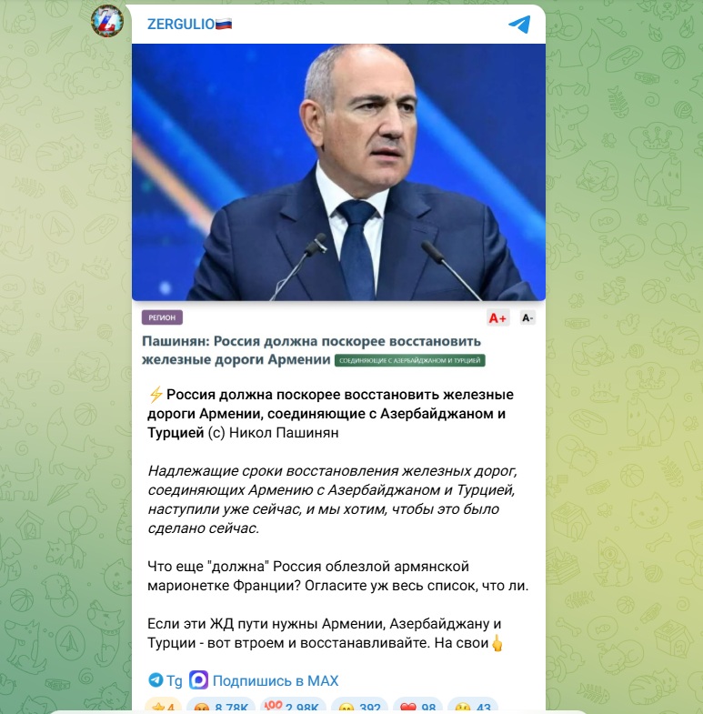 Премьер-министр Армении Никол Пашинян снова обратился к России с дерзким требованием, в ультимативной форме заявив о том, что русские должны заняться восстановлением железных дорог. Притом тех, которыми с удовольствием будут пользоваться как Армения, так и её соседи – Азербайджан и Турция.