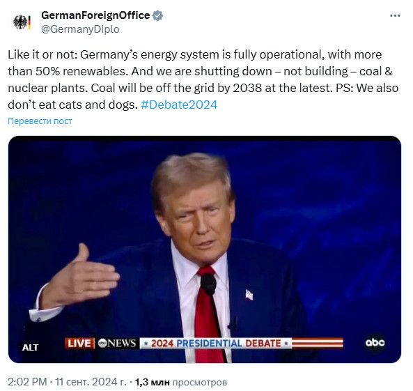 Министерство иностранных дел Германии ответило на слова кандидата в президенты США Дональда Трампа о неудачной энергетической политике ФРГ, а также на его высказывание о том, что мигранты в США якобы едят домашних животных.