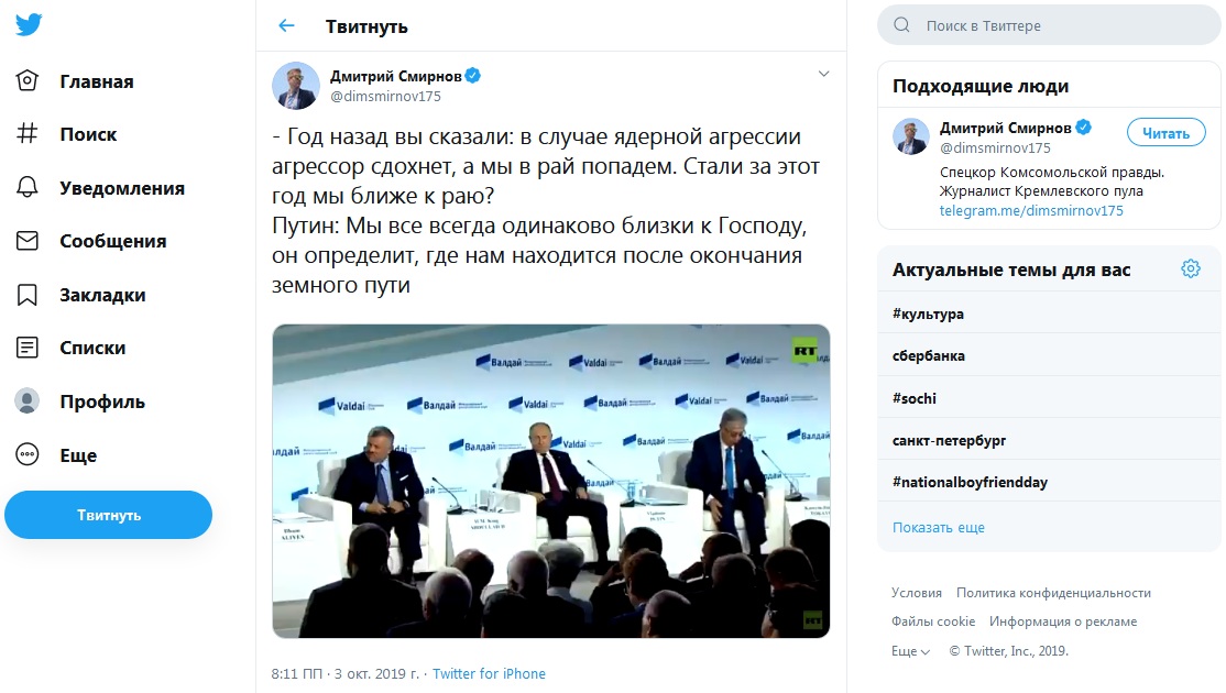 Это произошло на пленарной сессии международного дискуссионного клуба "Валдай". Один из журналистов напомнил Путину о его словах о том, что в случае ядерной агрессии агрессор сдохнет, а граждане России попадут в рай. После этого был задан двусмысленный вопрос о том, стала ли Россия за минувший год ближе к раю.