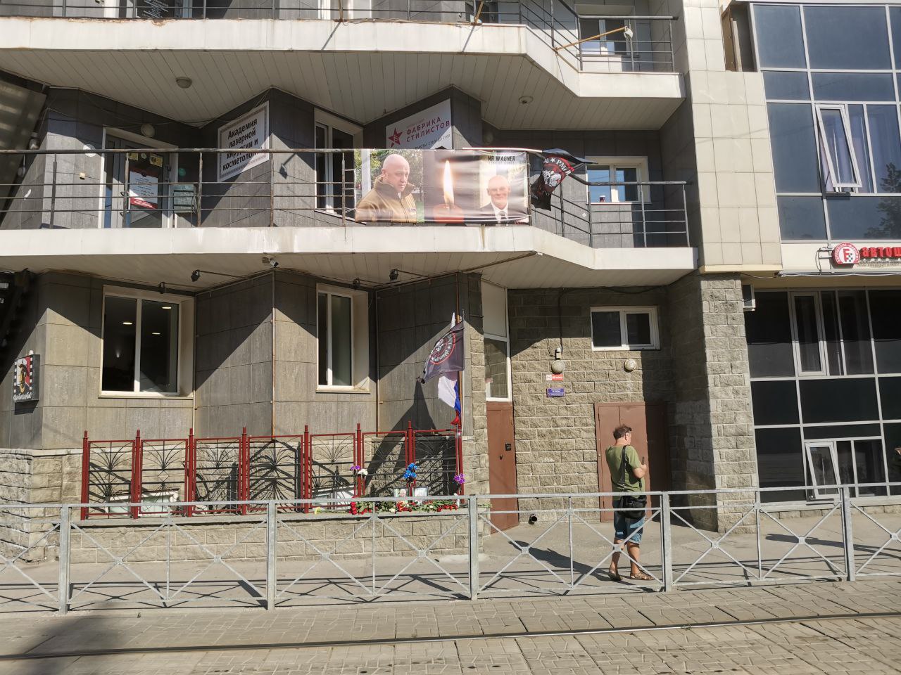 У офиса ЧВК "Вагнер" в Новосибирске появился стихийный мемориал, посвящённый погибшим в авиакатастрофе. Люди идут весь день к мемориалу, оставляют цветы у портретов Евгения Пригожина и Дмитрия Уткина.