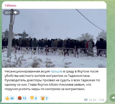 Накануне в Якутске порядка 500 мужчин вышли на площадь Ленина после убийства молодого земляка 18-летним приезжим из Таджикистана - "тоже гражданином".