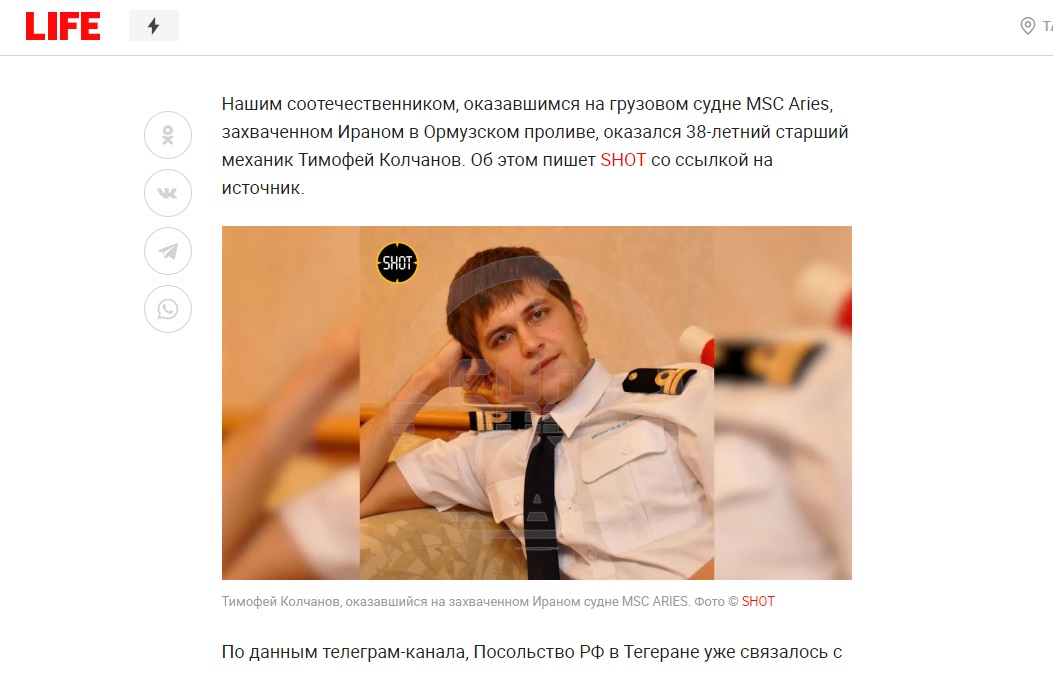 Проверка показала, что моряк из России там лишь один. Life.ru пишут, что это 38-летний старший механик Тимофей Колчанов. Посольство России уже связалось с иранскими коллегами, чтобы уточнить информацию о моряке. После родственникам сообщили, что с Колчановым всё в порядке:
