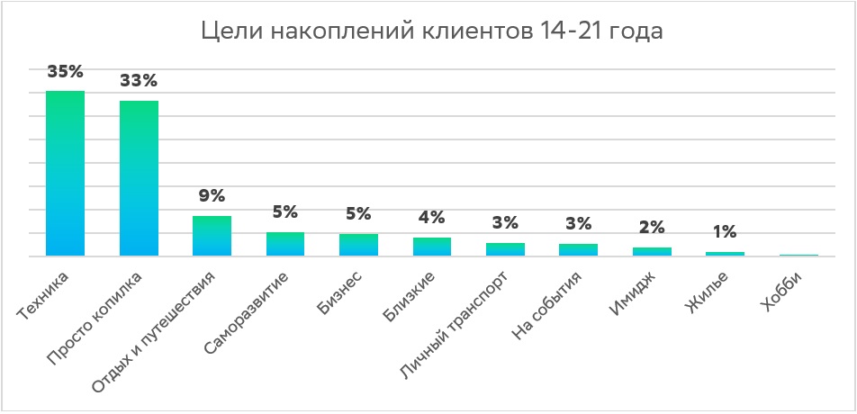 Аналитики банка рассказали, на что молодёжь копит чаще всего. Как оказалось, главная заветная цель - покупка техники. На втором месте - накопления без определённых целей, просто "на всякий случай". Также молодые люди копят на отдых и путешествия, саморазвитие и бизнес или, например, своих близких, транспорт, имидж, жильё и хобби. В процентном соотношении разделение целей можно увидеть в диаграмме чуть ниже.