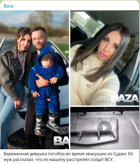 Киев "разъяснений" не дал. Более того, сегодня вечером журналистам Baza стало известно, что украинский военный, прячась в кустах, расстрелял 24-летнюю беременную Нину Кузнецову во время эвакуации семьи из Суджи.