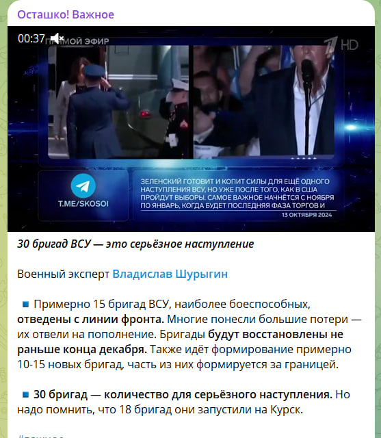 "Примерно 15 бригад ВСУ, наиболее боеспособных, отведены с линии фронта. Многие понесли большие потери - их отвели на пополнение. Бригады будут восстановлены не раньше конца декабря. Также идёт формирование примерно 10-15 новых бригад, часть из них формируется за границей. 30 бригад - количество для серьёзного наступления. Но надо помнить, что 18 бригад они запустили на Курск".