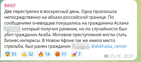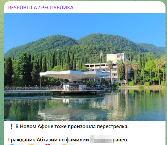 Местный телеграм канал "RESPUBLICA / РЕСПУБЛИКА" утверждает, что в Новом Афоне также произошла перестрелка, ранен гражданин Абхазии по фамилии Л.