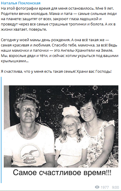 Наталья Поклонская трогательно поздравила свою маму с днём рождения. В своём Telegram-канале она выложила фото, где она ещё маленькая, с родителями, улыбается в объектив. "На этой фотографии время для меня остановилось", отмечает Поклонская.