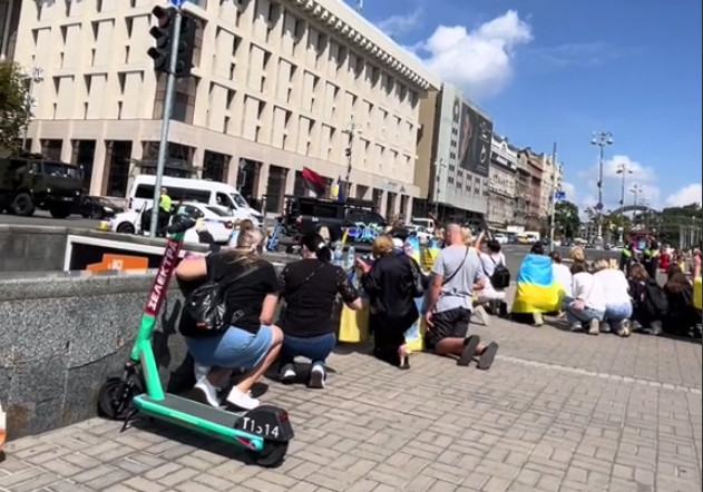 В столице Украины на похоронной процессии павших солдат ВСУ ведущий в микрофон приказал прохожим стать на колени. Ведущему не понравилось, что насколько человек снимают акцию на видео, но при этом стоят прямо и на колени не встают. Ведущий пригрозил увезти смельчаков в "бусике" в неизвестном направлении.