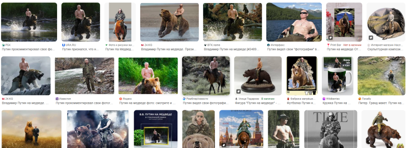 "Путин на медведе" – это очень известный мем. Стоит набрать эти три слова в любом поисковике – и откроется огромное поле народного творчества, как ни крути, отражающего уважение к президенту. Всё-таки если человека "усаживают" на медведя – это о многом говорит в плане восприятия его как сильной личности.