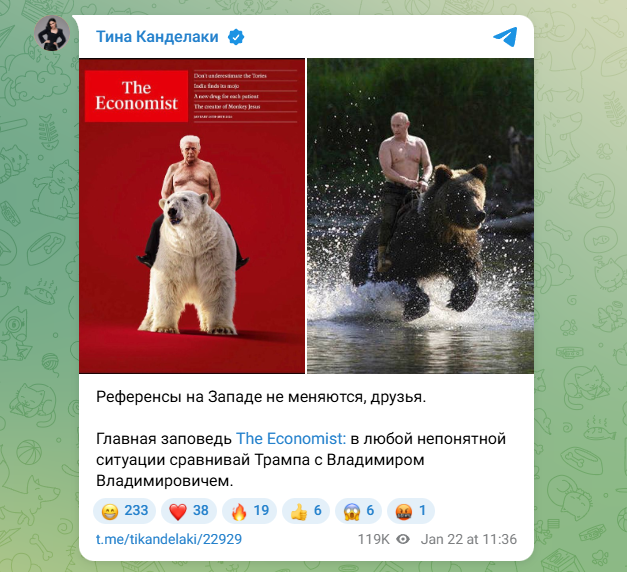 Тренд быстро уловили западные СМИ. И вот издание The Economist уже услужливо предлагает обложку, где Дональд Трамп восседает на медведе – правда, белом. Явный намёк на грядущее господство в Арктике – не зря ведь Штаты сейчас рьяно добиваются передачи им Гренландии.