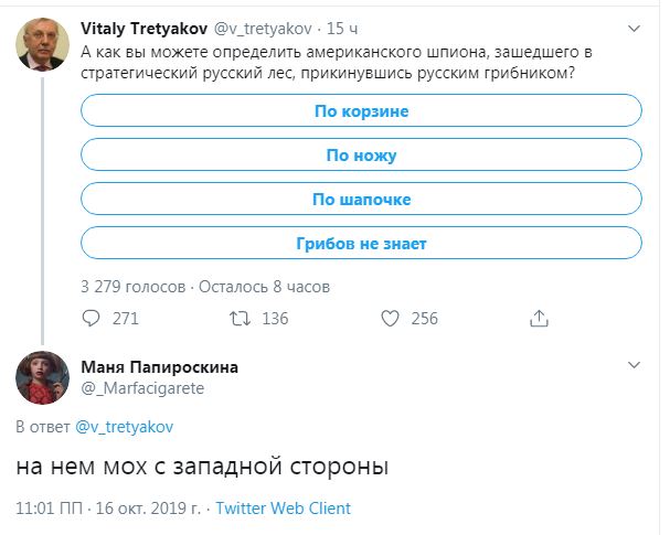 Декан Высшей школы телевидения МГУ Виталий Третьяков устроил по этому поводу шуточное голосование в своем Twitter, предложив подписчикам угадать признак американского шпиона, притворившегося русским грибником в русском лесу - корзина, нож, шапочка или незнание грибов. Однако в комментариях пользователи предложили свои варианты.