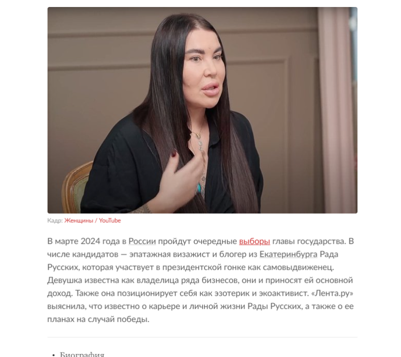Урождённая то ли москвичка, то ли екатеринбурженка (данные разнятся), Русских успела выдвинуть свою кандидатуру на пост президента России. Впрочем, самовыдвиженец явно не рассчитывала на успех предприятия: понятно, что этот ход был чисто пиаром.
