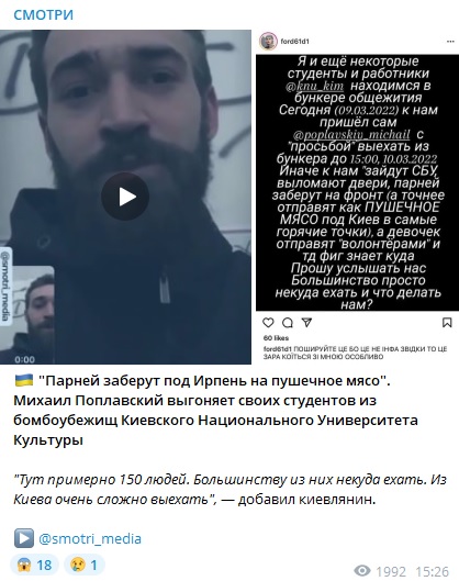По его словам, сейчас в бомбоубежище вуза находятся 150 студентов. Большинству из них некуда ехать. Из Киева вообще сейчас очень сложно выехать. И в такой ситуации к ним пришёл ректор университета Михаил Поплавский и "намекнул", что им нужно уходить.