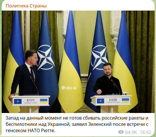 Запад на данный момент не готов сбивать российские ракеты и беспилотники над Украиной, заявил Зеленский после встречи с генсеком НАТО Рютте,