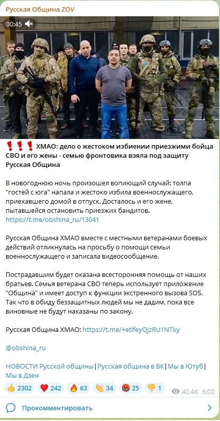 Очередное ЧП с участием "джигитов" произошло на сей раз в Ханты-Мансийском автономном округе. Там в кафе напали на ветерана СВО, который накануне Нового года приехал домой в отпуск, дабы встретить праздник с семьёй. Досталось не только самому бойцу, но и его жене: обоих буквально запинали толпой. Теперь женщина просит защиты, поскольку муж уже уехал обратно на фронт.
