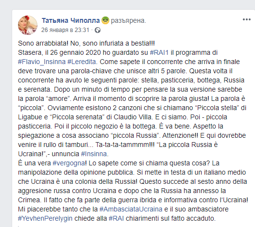 В нём ведущий Флавио Инсинна назвал Украину "Маленькой Россией", что вызвало шок у бывшей киевлянки, которая эмоционально написала в своём Facebook:
