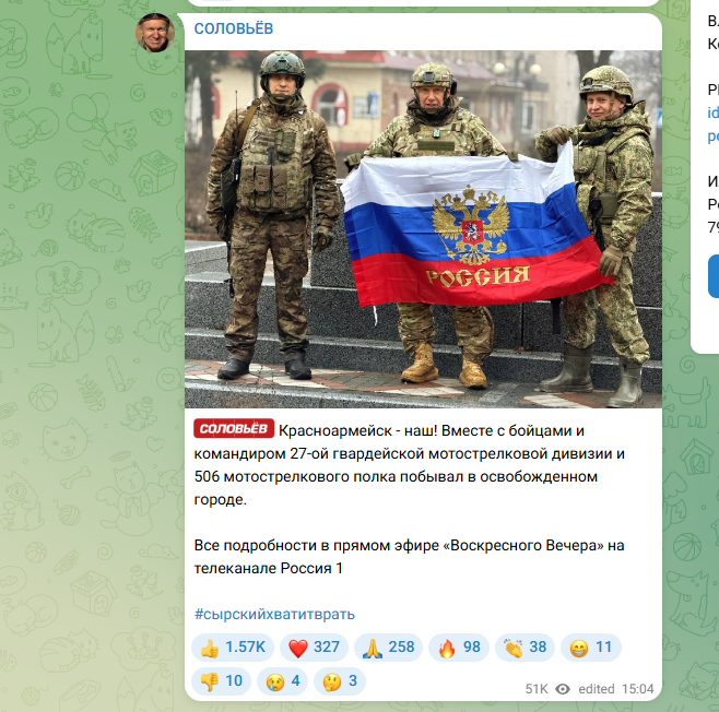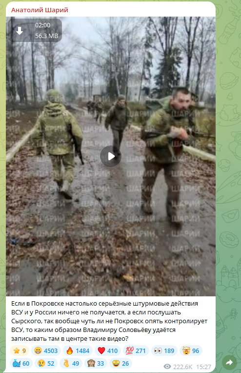 Если в Покровске настолько серьёзные штурмовые действия ВСУ и у России ничего не получается, а если послушать Сырского, так вообще чуть ли не Покровск опять контролирует ВСУ, то каким образом Владимиру Соловьёву удаётся записывать там в центре такие видео?