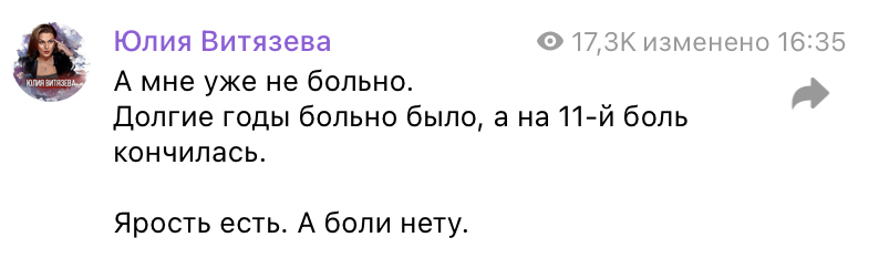 А мне уже не больно. Долгие годы больно было, а на 11-й боль кончилась. Ярость есть. А боли нету. Странное чувство. Но полезное. Сил придаёт потому что. И обостряет желание победить. Чтоб наказать всех виновных и со временем восстановить все разрушенное,