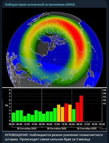 В настоящее время регистрируется резкое усиление геомагнитных колебаний. По последним измерениям, индекс геомагнитной активности Kp выброс до уровня 7.33, что соответствует сильной магнитной буре категории G3+ по 5-балльной шкале. События такого уровня последний раз наблюдались только 1 июня этого года когда по Земле был зарегистрирован прямой удар крупного солнечного протуберанца,