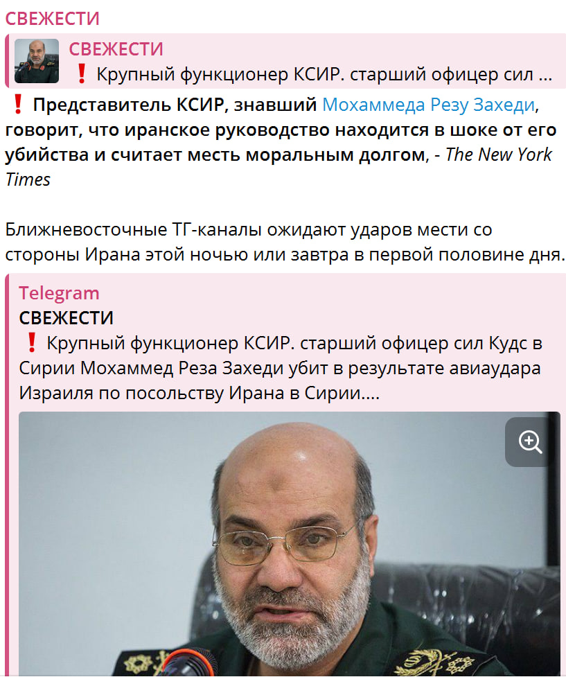 Ближневосточные ТГ-каналы ожидают ударов мести со стороны Ирана этой ночью или завтра в первой половине дня,