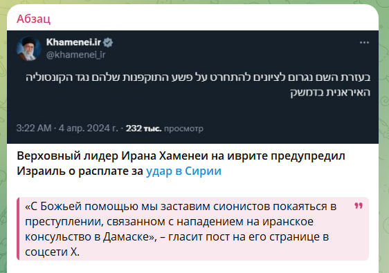 Также о скорой расплате Израиля за свои преступления предупредил Верховный лидер Ирана, причём сделал это на иврите. А иранский Верховный лидер, как известно, слов на ветер не бросает:
