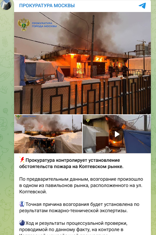 Известно, что московская прокуратура инициировала проверку последствий пожара на Коптевском рынке. Точную причину пока назвать не могут: назначена пожарно-техническая экспертиза.