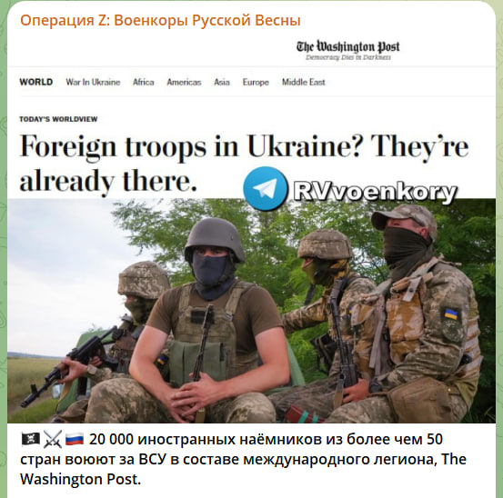Глава Следственного комитета России недавно заявил, что на стороне киевской хунты воюет около 590 наемников из 46 стран: это и американцы, и грузины, и британцы с канадцами, и израильтяне с немцами, и прибалты. Однако, по данным американского пропагандистского издания The Washington Post, в составе киевского иностранного легиона не меньше 20 тысяч наёмников, не считая предателей из Беларуси и России, а также других республик бывшего СССР. Русская армия, по подсчётам американцев, ликвидировала не менее 50 граждан США за последние два года.