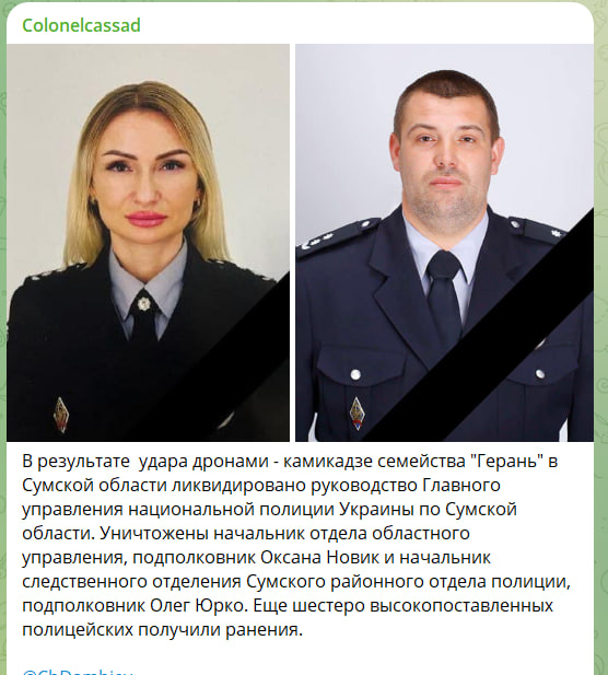 В результате точечного удара дронами-камикадзе русская армия ликвидировала двух начальников Главного управления Национальной полиции Украины по Сумской области. Так, 27 февраля о ликвидации руководства нацполиции в своём Telegram-канале сообщил военный обозреватель Борис Рожин.