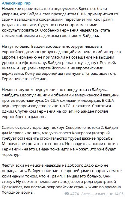 Фактически немецкие надежды на доброго дядю Джо не оправдались. Байден начинает с европейцами говорить тем же командным тоном, что и Трамп. Немцам это больно. Они стонут. Ну не хотят немцы жить под своего рода "доктриной Брежнева", - пишет Рар.