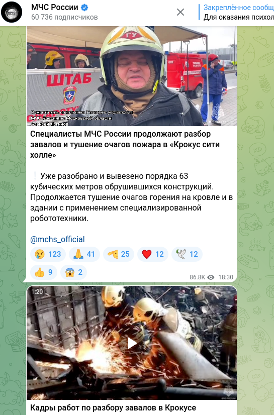 Тем временем губернатор Московской области Андрей Воробьёв уточнил, что спасатели "продолжают разбирать завалы в концертном зале и тушить оставшиеся очаги пожара". По его словам, "спасателям понадобится ещё несколько суток, чтобы полностью разобрать завалы".