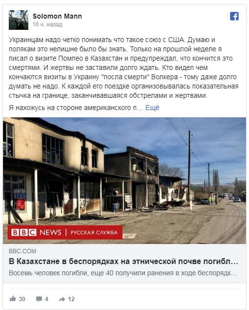 Массовые беспорядки произошли в середине прошедшей недели в Казахстане. Жертвами стали десять человек. По версии местного МВД, причиной стал дорожный конфликт. Однако по мнению израильского политолога Соломона Манна, эти события на фоне визита в Казахстан госсекретаря Майка Помпео не выглядят случайными. "Надо четко понимать, что такое союз с США", - написал он, обращаясь к украинцам.