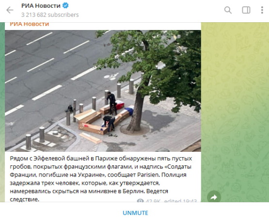 Пять пустых гробов, которые покрыты флагами Франции, с надписью "Солдаты Франции, погибшие на Украине", оставили возле Эйфелевой башни.