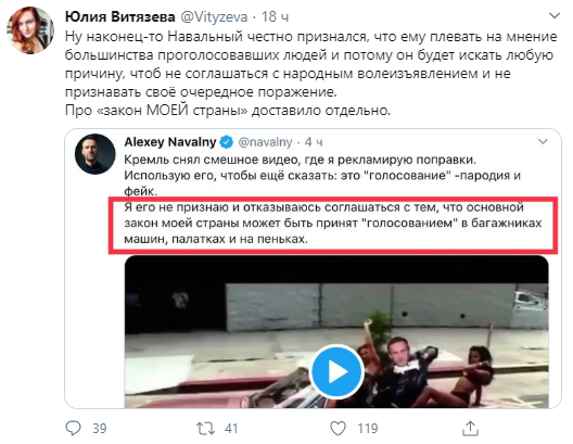 В частности, журналистка привела в пример пост Навального, где тот заявляет о своей истинной позиции - мнение большинства жителей России, высказываемое на голосовании за поправки в Конституцию, его не интересует.
