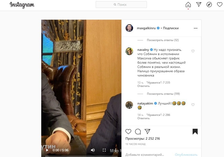 Алексей Навальный с ошибками вклинился в пародию Максима Галкина на Владимира Путина и Сергея Собянина, написав комментарий под новым видео юмориста в Instagram. Его внимание привлекло то, как артист сыграл московского мэра, чем блогер тут же поспешил поделиться, но не уследил за орфографией и словообразованием.