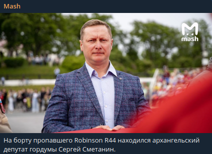 Как пишет Telegram-канал SHOT, внутри воздушного судна находились двое. Одним из членов экипажа был депутат Архангельской городской думы Сергей Сметанин, а вторым - местный бизнесмен Алексей Семёнов, хозяин фирмы по утилизации металлолома. По неподтверждённой информации, последний также являлся владельцем вертолёта.