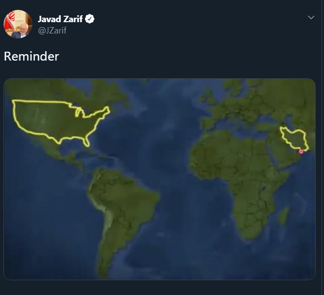 Ормузский пролив находится слишком далеко от Соединенных Штатов, которым не стоит вмешиваться в дела в этом регионе. Об этом министр иностранных дел Ирана решил напомнить Вашингтону. И сделал это одной картинкой с подписью "Напоминание", размещенной в Twitter.