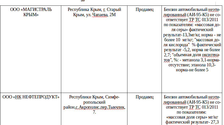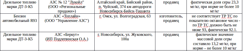 Фото: скриншот перечня фактов реализации фальсифицированного топлива на АЗС по итогам 2019 года Росстандарта.