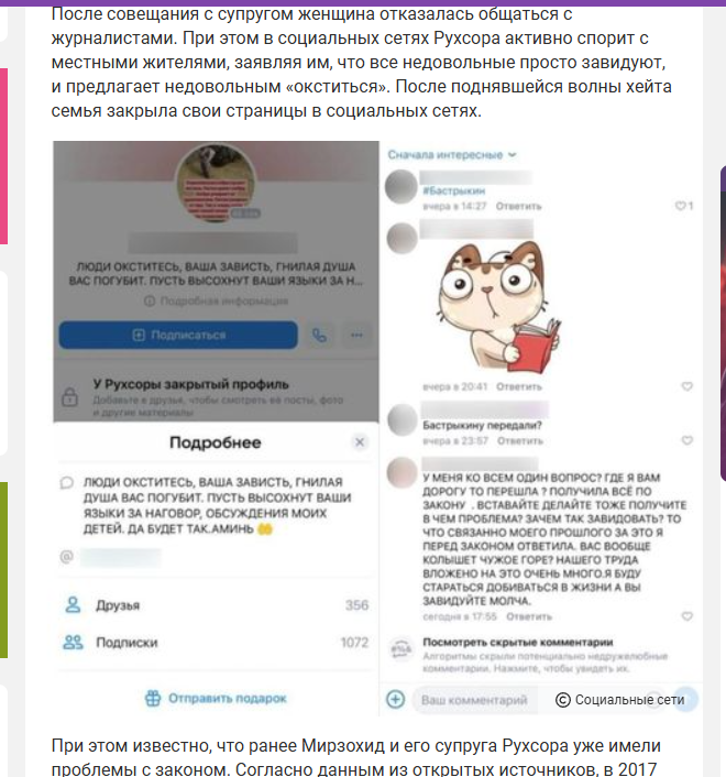 Разумеется, в соцсетях поднялась буря. В том числе потому, что семейство жило на широкую ногу. В соцсетях Мирзохид и Рухзода выкладывали снимки путешествий за границу и атрибутов "красивой жизни". Хвалились, что владеют несколькими объектами недвижимости. Выкладывали в соцсетях историю о том, как покупали машину стоимостью более 3 млн рублей.