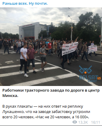 В руках рабочие несут плакаты, на которых написано "Нас не 20 человек, а 16 000". Это является своеобразным ответом на заявление президента Белоруссии Александра Лукашенко.
